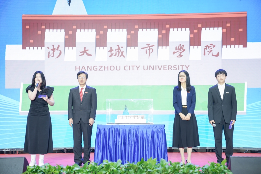 毕业生代表将城院“新貌”3D组合模型赠予母校。该模型由学校新校门、新学术中心(图书馆)组合而成,寓意学校转公之后开启新征程,蕴含了对学校迈上新起点、实现新跨越的美好祝愿。洪庆华、杨波代表学校接受这份来自2024届毕业生的真挚情谊。随后,全体毕业生向在场所有教职工与家长鞠躬致谢。
