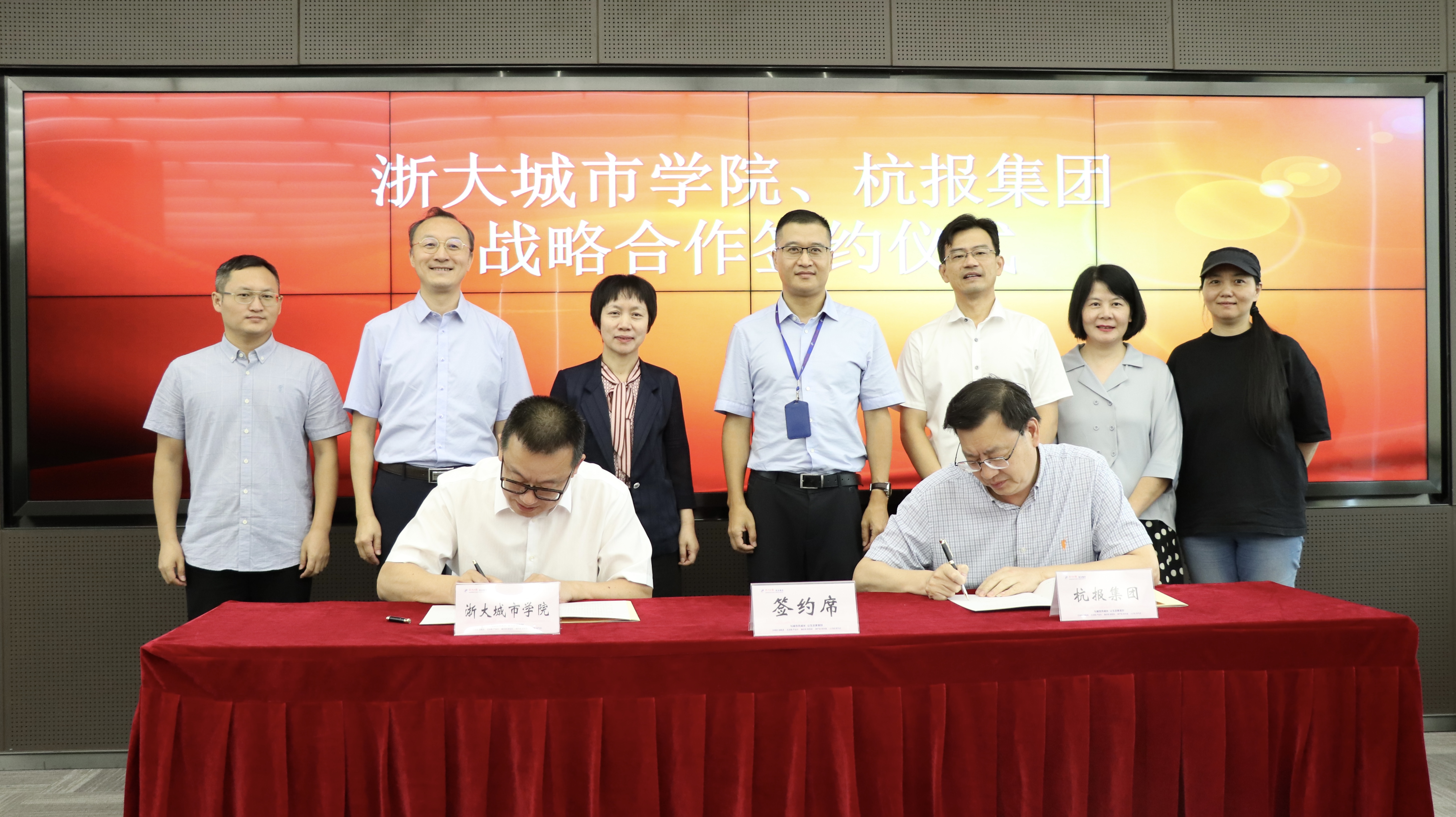 传媒与人文学院院长沈爱国与杭报集团副总编辑莫士安分别代表双方签约