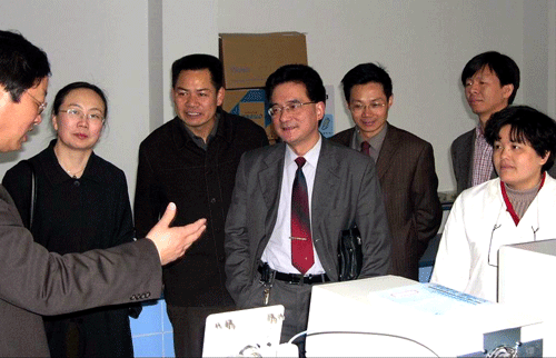 3月17日,杭州市教育局高师处处长吴作为一行6人,对城市学院市级重点学科建设进展情况进行检查。检查组对城市学院的重点学科建设工作给予了肯定,认为在重点学科发展的独立性、应用性、开放性、人才培养的特色化以及处理与教学改革的关系等方面积累了一定经验。图为检查组参观学科建设实验室。