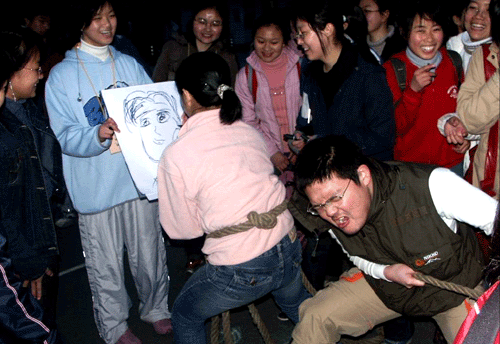 城市学院生命科学分院昨晚举办的趣味拔河比赛令人捧腹,最后一名把绳的女同学居然还能提笔作画。你提笔,我拼力!一动一静,妙趣横生。